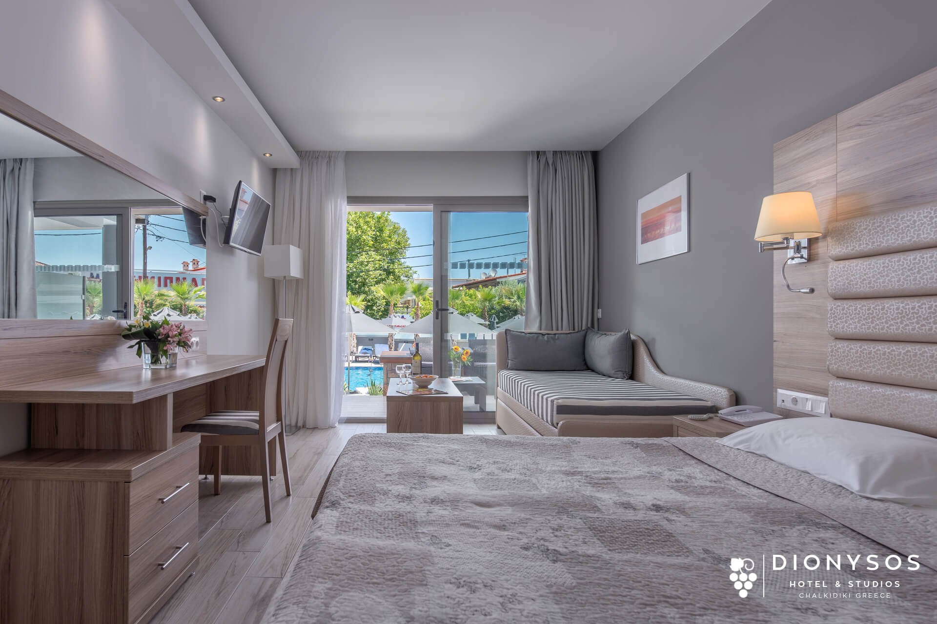 Местоположенмие: хотел "Dionysos hotel and Suites" се намира в селището Ханиоти, на първия ръкав на Халкидики - Касандра, на 150 м. от плажа и 250 м. от центъра.