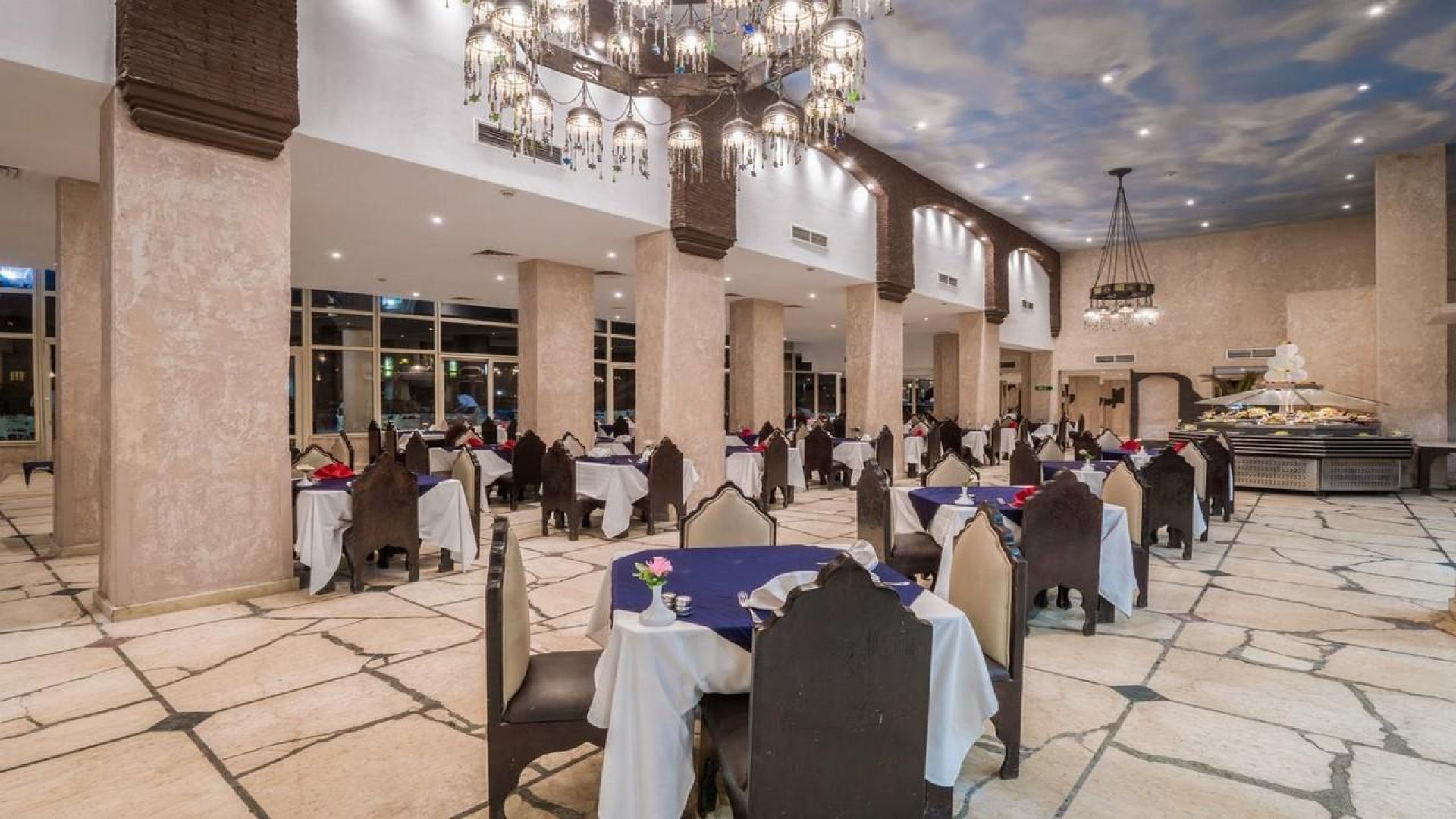 Концепцията е All Inclusive – закуска, обяд, вечеря на блок маса, леки следобедни закуски, сладкиши, местни алкохолни и безалкохолни напитки в определени часове от деня. Хотелът разполага с основен ресторант и няколко а ла карт ресторанта (италиански, ориенталски и рибен), както и разнообразни барове – лоби бар, бар на плажа, бар при басейна.